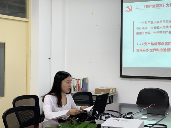 会上,党总支副书记倪娜对《共产党宣言》进行了导读,带领大家一起学习了它的产生过程、主旨精神、伟大意义以及对中国的影响。倪老师说到,马克思、恩格斯通过《共产党宣言》分析了西方存在过的和正存在着的各种各样无产阶级理想、口号、形态,提出了科学的无产阶级革命的理论和主张,为无产阶级未来发展指明了前进方向、历史使命和阶级责任。强调要结合时代变化学习《共产党宣言》,批判继承,理性看待。